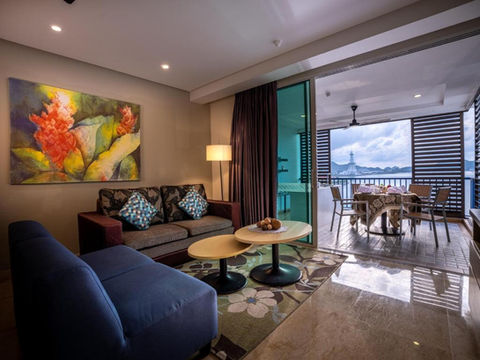 Experience the elegance of our 46m² Executive Studio Suite, available in city or sea view. Designed for couples, it features an extra-large double bed, a cosy living area, and a private kitchenette with an oven. Additional cooking facilities are available for rental. Enjoy modern comforts like air conditioning, a flat-screen TV, free WiFi, and a well-appointed bathroom. Step onto your private balcony or terrace to soak in the breathtaking views and fresh island breeze. A perfect retreat for an unforgettable Langkawi getaway.