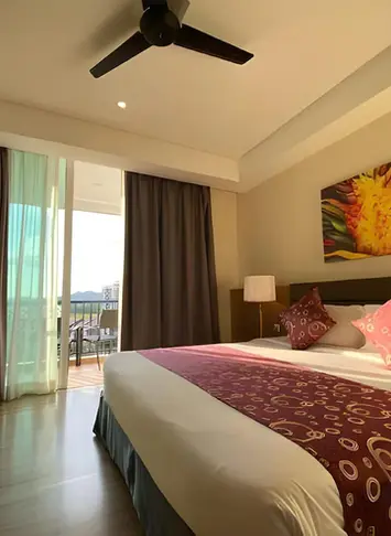 Experience the space and comfort of our 46m² Executive Family Studio Suite, ideal for up to four adults. It features an extra-large double bed, a cosy sofa bed, and a kitchen with an oven. Additional cooking facilities are available for rental. Enjoy air conditioning, a flat-screen TV, free WiFi, and a well-appointed bathroom. Step onto your private balcony or terrace for stunning city or sea views. A perfect retreat for a memorable Langkawi getaway.